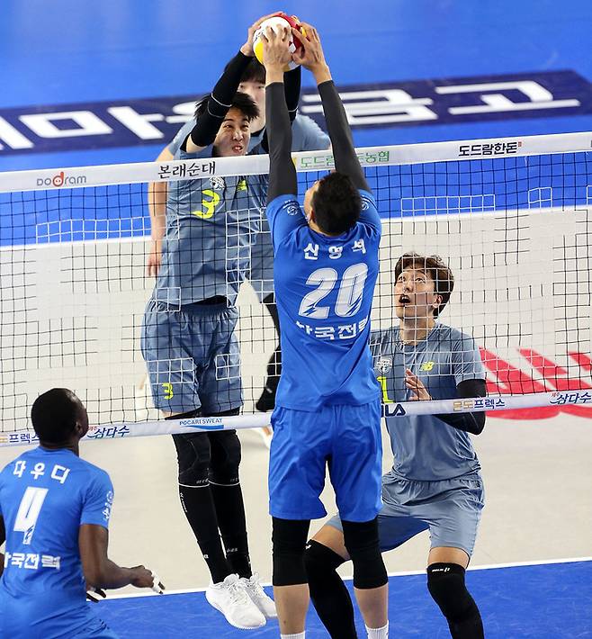 [서울=뉴시스] 이영환 기자 = 3일 천안 유관순체육관에서 열린 도드람 V리그 현대캐피탈과 한국전력의 경기, 현대캐피탈 김명관과 한국전력 신영석이 경합을 벌이고 있다. (사진=현대캐피탈 배구단 제공) 2021.12.03. photo@newsis.com