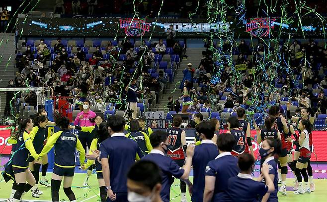 [서울=뉴시스] 이영환 기자 = 3일 수원실내체육관에서 열린 도드람 V리그 현대건설과 인삼공사의 경기, 현대건설이 승리해 12연승을 기록하자 축포가 터지고 있다. (사진=현대건설 배구단 제공) 2021.12.03. photo@newsis.com *재판매 및 DB 금지