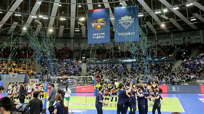 [서울=뉴시스] 이영환 기자 = 3일 수원실내체육관에서 열린 도드람 V리그 현대건설과 인삼공사의 경기, 현대건설이 승리해 12연승을 기록하자 축포가 터지고 있다. (사진=현대건설 배구단 제공) 2021.12.03. photo@newsis.com *재판매 및 DB 금지