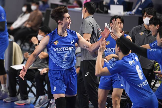 [서울=뉴시스] 이영환 기자 = 3일 천안 유관순체육관에서 열린 도드람 V리그 현대캐피탈과 한국전력의 경기, 한국전력 박철우가 동료들과 기쁨을 만끽하고 있다. (사진=한국전력 배구단 제공) 2021.12.03. photo@newsis.com *재판매 및 DB 금지