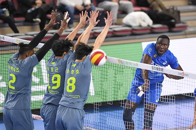 [서울=뉴시스] 이영환 기자 = 3일 천안 유관순체육관에서 열린 도드람 V리그 현대캐피탈과 한국전력의 경기, 한국전력 다우디가 스파이크를 하고 있다. (사진=한국전력 배구단 제공) 2021.12.03. photo@newsis.com *재판매 및 DB 금지