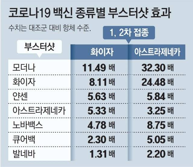 부스터샷에서도 모더나와 화이자 같은 메신저리보핵산(mRNA) 방식의 백신이 효과가 더 좋은 것으로 나왔다고 NYT는 전했다. 1, 2차에 화이자 백신을 접종한 그룹이 부스터샷으로 발네바 백신을 맞았을 땐 대조군에 비해 항체가 1.31배 증가했는데 모더나는 11.49배 많아졌다고 NYT는 전했다. 1, 2차에 AZ 백신을 맞고 부스터샷도 AZ 백신으로 맞으면 항체 수치가 대조군 대비 3.25배였는데 화이자는 24.5배, 모더나는 32.3배였다. 미국 제약사 노바백스가 오미크론 변이 맞춤형 백신을 다음 달부터 생산할 수 있다고 발표했다고 로이터통신 등이 2일 보도했다. 정기석 한림대 성심병원 호흡기내과 교수는 “대상자 규모가 크고 연구 설계도 잘된 것으로 보인다”며 “교차접종의 항체 증가 폭이 (일반 접종보다) 더 크다는 결과도 최근 발표되는 관련 논문과 경향성이 일치한다”고 했다.