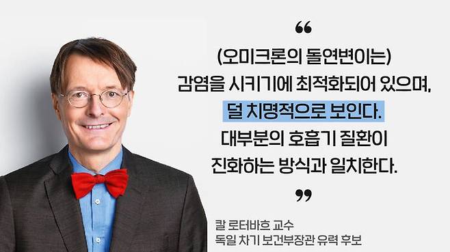 그럼에도 불구하고 낙관론이 나오기 시작했다. 가장 강력한 낙관론을 설파한 사람으로는 독일의 감염병학자 출신 국회의원 칼 로터바흐 교수를 들 수 있다. 외신들에 따르면, 독일 차기 보건부장관 유력 후보인 로터바흐 박사는 "오미크론이 남아공 의사들이 말한 것처럼 비교적 덜 심각한 증상을 유발할 경우, 코로나19팬데믹의 종식을 앞당길 수 있는 '크리스마스 선물'이 될 수 있다"고 말했다. 바이러스는 숙주가 죽으면 자신을 복제할 수 없으므로 전파력은 강해지면서 독성은 약화하는 쪽으로 진화하는 경향이 있는데, 오미크론이 바로 그렇게 등장한 것일 수 있다는 얘기다.