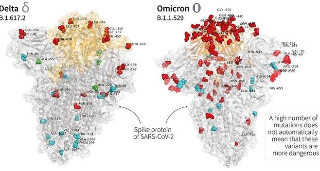 그런데 문제는, 오미크론 변이는 델타보다 훨씬 많은 돌연변이를 갖고 있다는 점이다.