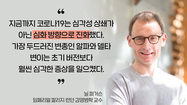 영국 임페리얼칼리지런던의 질병 발병 분석 및 모델링그룹 책임자인 닐 퍼거슨 교수는 의회 자문위원회에서 "오미크론 변이가 가벼운 증상의 질병으로 진화했을 거라고 속단해선 안된다"고 말했다. "과거 일부 바이러스가 시간이 지남에 따라 증상이 약해지는 방식으로 진화했지만, 모든 바이러스가 항상 그런 건 아니었다"는 것이다. 퍼거슨 교수는 코로나 바이러스는 호흡기에서 빨리 증식해 도로 나가는 데에만 관심이 있지, 숙주가 된 사람이 열흘 이상 지난 뒤에 죽든 말든 상관하지 않는다고도 덧붙였다.