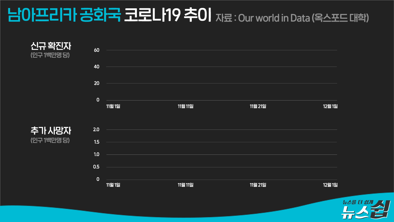 11월 이후의 남아공 상황 그래프를 보면 신규확진자 그래프가 급속하게 우상향한다. 이는 오미크론 변이의 확산 탓으로 보이는데, 해당 기간의 사망자 그래프는 정체상태를 보인다.