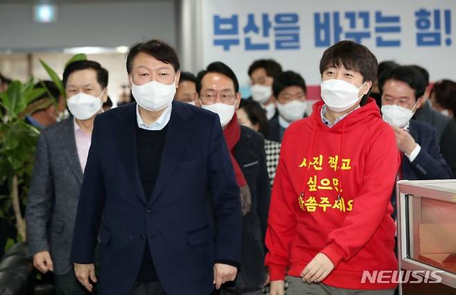 [부산=뉴시스] 하경민 기자 = 국민의힘 윤석열 대선 후보와 이준석 당 대표가 4일 오전 부산 수영구 부산시당에서 열린 선거대책회의에 참석하기 위해 회의장으로 이동하고 있다. 2021.12.04. yulnetphoto@newsis.com