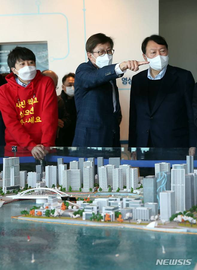 [부산=뉴시스] 하경민 기자 = 국민의힘 윤석열 대선 후보와 이준석 당 대표가 4일 부산 동구 부산항국제여객터미널 내 북항재개발 홍보관을 방문, 북항재개발 조형도를 둘러보고 있다. 2021.12.04. yulnetphoto@newsis.com