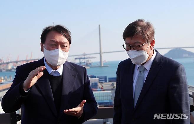 [부산=뉴시스] 하경민 기자 = 국민의힘 윤석열 대선 후보가 4일 부산 동구 부산항국제여객터미널 내 북항재개발 홍보관을 방문, 박형준 부산시장과 북항재개발 지역을 둘러보고 있다. 2021.12.04. yulnetphoto@newsis.com