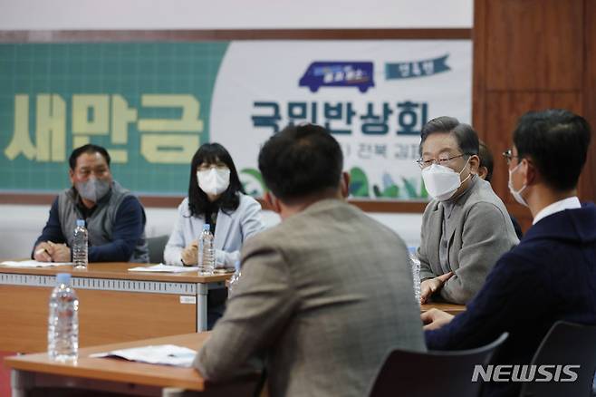 [김제=뉴시스] 최동준 기자 = 이재명 더불어민주당 대선 후보가 4일 전북 김제시 한국농어촌공사 새만금33센터에서 '희망의 보금자리, 새만금' 국민방상회를 하고 있다 . 2021.12.04. photocdj@newsis.com