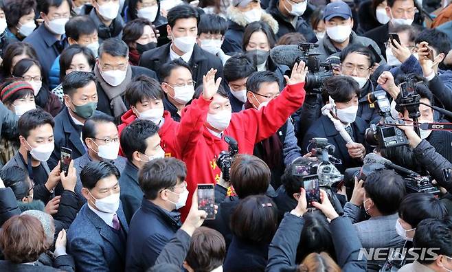 [부산=뉴시스] 하경민 기자 = 국민의힘 윤석열 대선 후보와 이준석 당 대표가 4일 부산 부산진구 서면 일대에서 지지를 호소하며 시민들에게 인사하고 있다. 2021.12.04. yulnetphoto@newsis.com