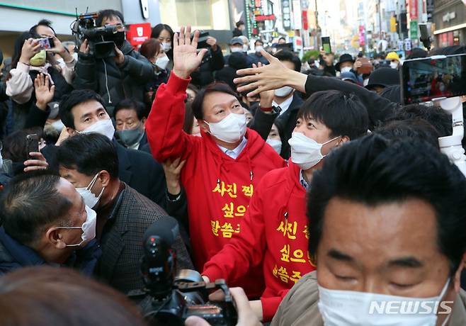 [부산=뉴시스] 하경민 기자 = 국민의힘 윤석열 대선 후보가 이준석 당 대표와 함께 4일 부산 부산진구 서면 일대에서 지지를 호소하며 시민들에게 인사하고 있다. 2021.12.04. yulnetphoto@newsis.com