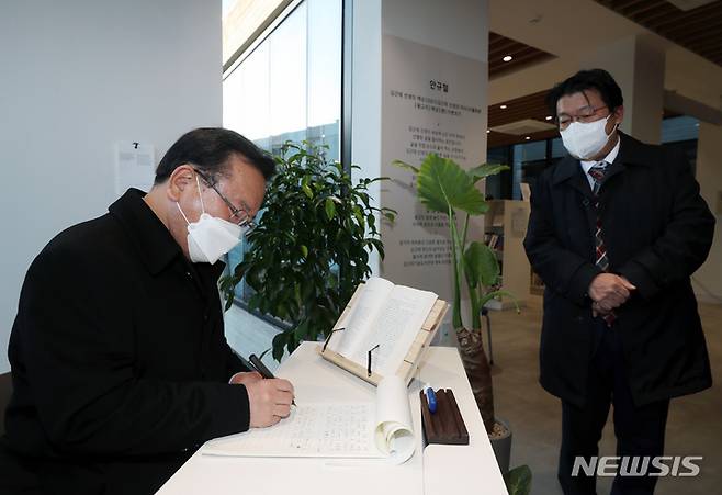 [서울=뉴시스] 고승민 기자 = 4일 서울 도봉구 김근태기념도서관에서 열린 개관식에서 김부겸 국무총리가 김근태 전 열린우리당 의장을 다룬 도서를 잠시 필사하고 있다. 2021.12.04. kkssmm99@newsis.com