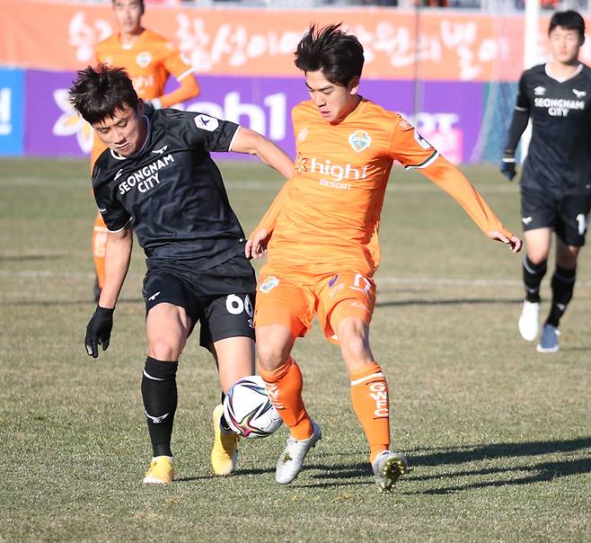 [춘천=뉴시스] 김경목 기자 = 4일 오후 강원FC 공격수 김대원 선수가 강원 춘천시 춘천송암스포츠타운 축구장에서 열린 하나원큐 K리그1(1부리그) 2021 38라운드 경기에서 성남FC의 공을 빼앗으려고 안간힘을 쓰고 있다 있다. 2021.12.04. photo31@newsis.com