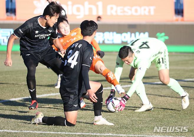 [춘천=뉴시스] 김경목 기자 = 4일 오후 강원FC, 성남FC 선수들이 강원 춘천시 춘천송암스포츠타운 축구장에서 열린 하나원큐 K리그1(1부리그) 2021 38라운드 경기에서 공을 잡기 위해 최선을 다하고 있다. 2021.12.04. photo31@newsis.com