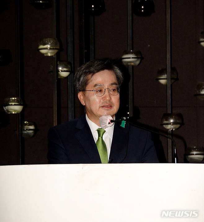 [청주=뉴시스] 조성현 기자 = 대선 출마를 선언한 김동연 새로운물결 중앙당 창당준비위원장이 4일 오후 충북 청주시 서원구 CJB컨벤션센터에서 열린 '2021 새로운물결 충북도당 창당대회'에 참석해 인사말을 하고 있다. 2021.12.04. jsh0128@newsis.com