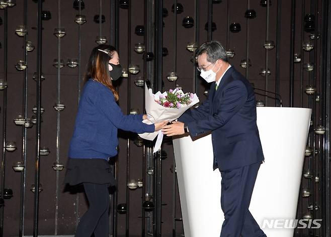 [청주=뉴시스] 조성현 기자 = 대선 출마를 선언한 김동연 새로운물결 중앙당 창당준비위원장이 4일 오후 충북 청주시 서원구 CJB컨벤션센터에서 열린 '2021 새로운물결 충북도당 창당대회'에 참석해 당원으로부터 꽃다발을 받고 있다. 2021.12.04. jsh0128@newsis.com
