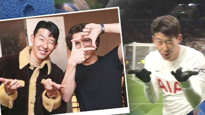 손흥민은 자신의 SNS에 '스파이더맨과 소니'란 제목으로 영화 스파이더맨 시리즈의 주인공인 영국 배우 톰 홀랜드와 만난 사진을 공개했습니다.