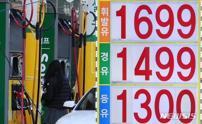[서울=뉴시스] 배훈식 기자 = 유류세 인하로 3주째 전국 휘발유 가격이 하락한 5일 오전 서울 중구의 한 주유소에서 휘발유를 1600원 대에 판매하고 있다. 2021.12.05. dahora83@newsis.com