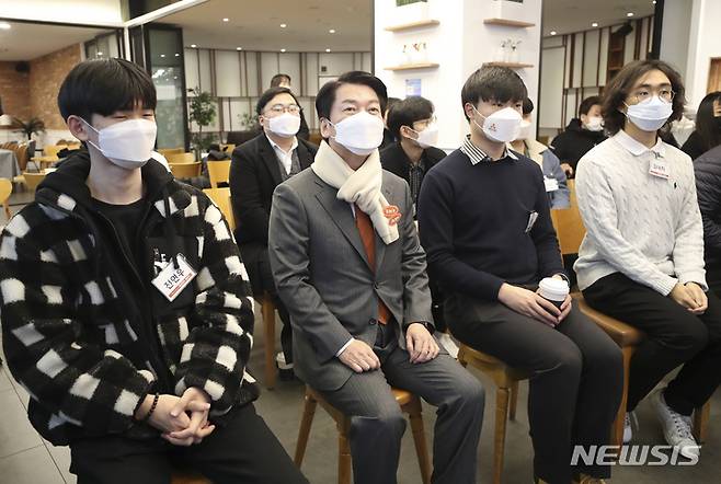 [서울=뉴시스] 최진석 기자 = 안철수 국민의당 대선 후보가 5일 오전 서울 여의도 한 카페에서 열린 '안철수와 함께하는 청년내각 출범식'에 참석해 자리하고 있다. 2021.12.05. myjs@newsis.com