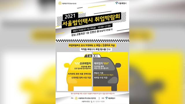 서울시와 서울택시운송사업조합은 오는 8일부터 사흘 동안 잠실 교통회관 1층 컨벤션홀에서 '2021 서울법인택시 취업박람회'를 연다고 오늘(5일) 밝혔습니다.