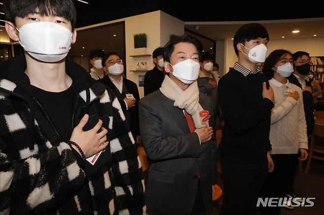 [서울=뉴시스] 국회사진기자단 = 안철수 국민의당 대선 후보가 5일 오전 서울 여의도의 한 카페에서 열린 '안철수와 함께하는 청년내각 출범식'에서 국민의례를 하고 있다. 2021.12.05. photo@newsis.com