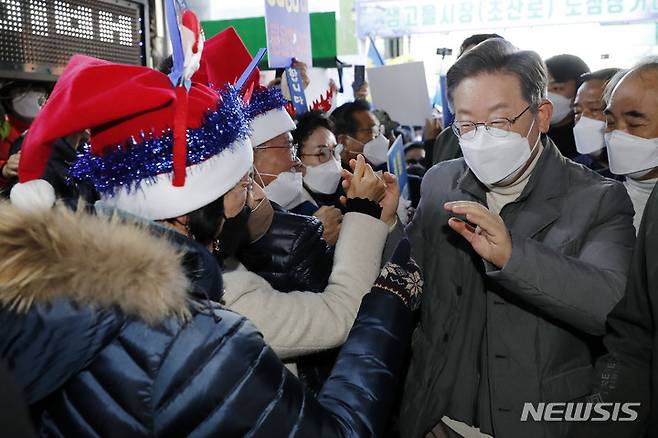 [정읍=뉴시스] 최동준 기자 = 이재명 더불어민주당 대선 후보가 5일 전북 정읍시 샘고을시장을 방문해 지지자들과 인사하고 있다. 2021.12.05. photocdj@newsis.com
