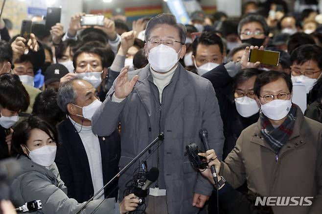 [정읍=뉴시스] 최동준 기자 = 이재명 더불어민주당 대선 후보가 5일 전북 정읍시 샘고을시장을 방문해 지지를 호소하고 있다. 2021.12.05. photocdj@newsis.com