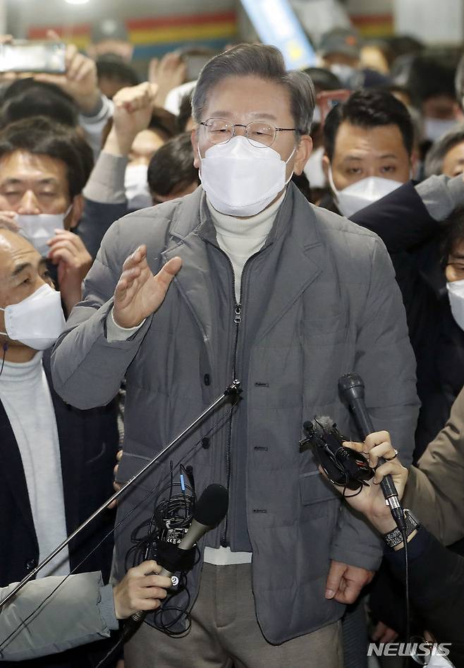 [정읍=뉴시스] 최동준 기자 = 이재명 더불어민주당 대선 후보가 5일 전북 정읍시 샘고을시장을 방문해 지지 호소 연설을 하고 있다. 2021.12.05. photocdj@newsis.com