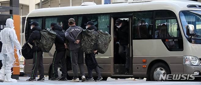 [서울=뉴시스] 백동현 기자 = 5일 오전 서울 시내 한 호텔 앞에서 군인들이 통제를 받으며 이동하고 있다. 해당 군부대 공보장교에 따르면 이들은 지난 4일 코로나19 확진자 1명이 나온 수도권 군부대 인원들로, 직·간접 접촉자 분류돼 호텔에서 10일간 1인실 격리조치를 받게 된다. 2021.12.05. livertrent@newsis.com