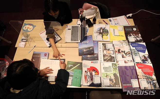 [서울=뉴시스] 추상철 기자 = 2021 호주 유학박람회가 열린 5일 오후 서울 강남구 코엑스에서 학생이 호주 대학 유학 상담을 받고 있다. 2021.12.05. scchoo@newsis.com