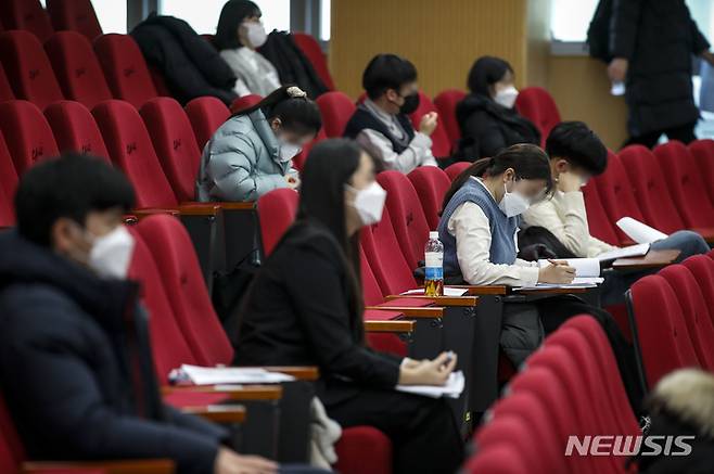 [서울=뉴시스] 정병혁 기자 = 5일 오전 서울 동작구 중앙대학교에서 열린 다빈치형인재(인문·자연계열) 면접고사를 치르는 수험생들이 대기장소에서 막바지 점검을 하고 있다. 2021.12.05. jhope@newsis.com
