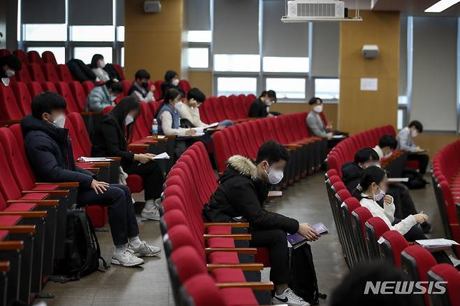 [서울=뉴시스] 정병혁 기자 = 5일 오전 서울 동작구 중앙대학교에서 열린 다빈치형인재(인문·자연계열) 면접고사를 치르는 수험생들이 대기장소에서 막바지 점검을 하고 있다. 2021.12.05. jhope@newsis.com