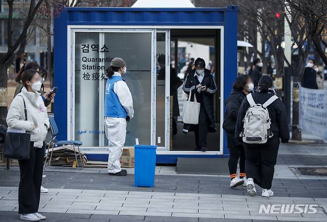 [서울=뉴시스] 정병혁 기자 = 5일 오전 서울 동작구 중앙대학교에서 수험생들이 다빈치형인재(인문·자연계열) 면접고사를 위해 시험장 가기 전 검역소에서 체온 확인을 하고 있다. 2021.12.05. jhope@newsis.com