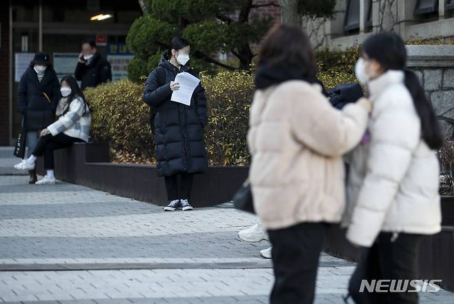 [서울=뉴시스] 정병혁 기자 = 5일 오전 서울 동작구 중앙대학교에서 수험생이 다빈치형인재(인문·자연계열) 면접고사를 위해 시험장으로 향하기 전 어머니의 응원을 받고 있다. 2021.12.05. jhope@newsis.com
