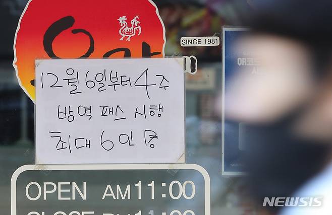 [서울=뉴시스] 배훈식 기자 = 사적모임 최대인원을 수도권 6인, 비수도권 8인으로 제한하는 방역 패스 시행을 하루 앞둔 5일 오후 서울 종로구의 한 음식점에 이를 알리는 안내문이 붙어 있다. 2021.12.05. dahora83@newsis.com