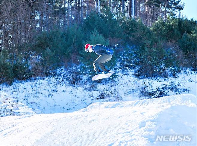 [횡성=뉴시스] 이덕화 기자 = 5일 강원 횡성군 소재 웰리힐리스노우파크를 찾은 한 보더가 하얀 눈 위에서 점핑을 선보이며 겨울 스포츠를 즐기고 있다. 2021.12.05. wonder8768@newsis.com