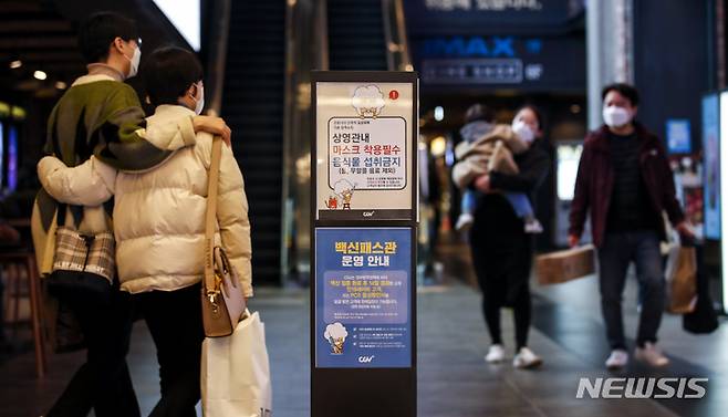 [서울=뉴시스] 정병혁 기자 = 6일부터 4주 동안 사적모임 최대 인원이 수도권 6명, 비수도권 8명으로 제한된다. 또 식당과 카페를 비롯한 각종 실내 다중이용시설로 방역패스 적용이 확대됐다. 이에 따라 식당·카페를 비롯해 학원, PC방, 영화관, 공연장, 도서관, 독서실, 스터디카페, 박물관, 미술관 등을 이용할 때는 백신 접종완료일로부터 2주(14일)가 지났다는 증명서나 PCR 음성확인서가 필요하다. 사진은 5일 오후 서울시내 한 영화관에 백신패스관 운영 안내문이 붙어 있는 모습. 2021.12.05. jhope@newsis.com