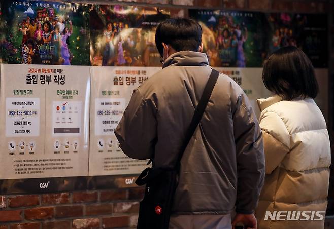 영화관 출입 명부 작성하는 관람객들