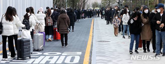 [서울=뉴시스] 백동현 기자 = 코로나19 신규 확진자가 5,128명으로 집계된 5일 오후 서울 서초구보건소 선별진료소에서 시민들이 검사를 받기 위해 대기하고 있다. 2021.12.05. livertrent@newsis.com