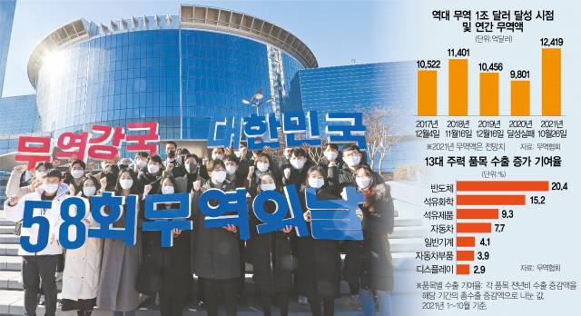 올해 우리나라 무역규모는 299일만인 사상 최단 기간에 1조 달러를 달성했다. 코로나19 이전 규모를 회복하는 수준을 넘어서며 글로벌 경기회복을 선도했다는 평가가 나온다. 특히 올해 수출은 2018년 실적(6,049억 달러)을 웃도는 역대 최대 실적을 달성할 전망이다. 반도체를 비롯해 석유화학, 자동차 등 주력 품목의 고른 수출 증가세도 눈길을 끈다.