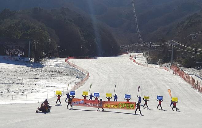 [서울=뉴시스] 조수정 기자 = 5일 부영그룹 무주덕유산리조트에서 21/22 동계시즌 스키장 개장을 기념해 패트롤 대원 등이 현수막과 피켓을 들고 슬로프를 내려오는 이벤트를 선보이고 있다. (사진=부영그룹 제공) 2021.12.05. photo@newsis.com