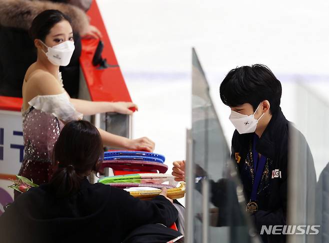 [의정부=뉴시스] 홍효식 기자 = 5일 경기도 의정부 실내빙상장에서 열린 2021 KB금융 전국남녀 피겨스케이팅 회장배 랭킹대회를 마친 유영(왼쪽)과 차준환이 시상식 준비를 하고 있다. 2021.12.05. yesphoto@newsis.com