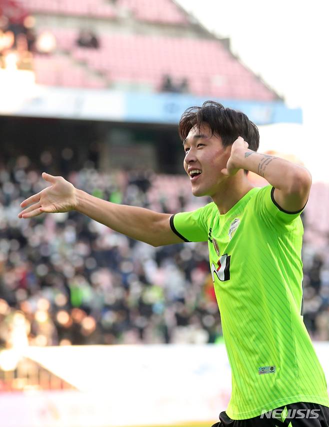 [전주=뉴시스] 김얼 기자 = 하나원큐 K리그1 2021 전북현대와 제주유나이티드 경기가 열린 5일 전북 전주시 전주월드컵경기장에서 전북현대 송민규 선수가 골을 넣고 세리머니를 하고 있다. 2021.12.05. pmkeul@newsis.com