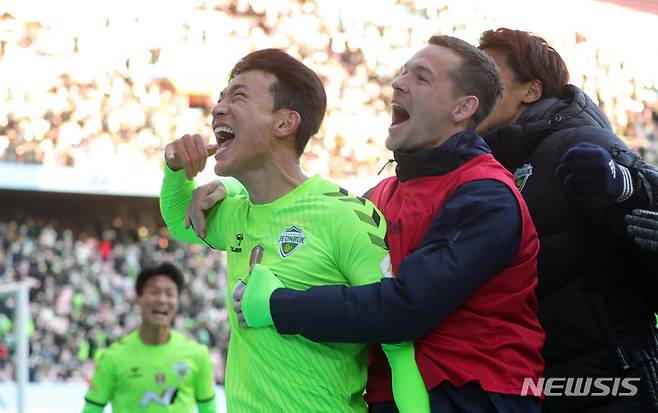 [전주=뉴시스] 김얼 기자 = 하나원큐 K리그1 2021 전북현대와 제주유나이티드 경기가 열린 5일 전북 전주시 전주월드컵경기장에서 전북현대 한교원 선수가 골을 넣고 세리머니를 하고 있다. 2021.12.05. pmkeul@newsis.com