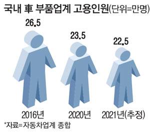 전장부품 대신 내연기관차 엔진 등에만 집중해온 국내 부품 업계는 급격한 산업 격변에 미처 대비하지 못했다. 2016년 26만5000여 명에 달했던 부품 업계 고용인원은 올해까지 5년 새 4만명, 최근 1년 새 1만명이나 감소했다. 부품 업체 관계자는 "경영 사정이 어려워도 이를 대놓고 말할 수 없다"며 "정부 협조로 금융 지원을 받고 있는데 매출 부진을 말하는 순간 금융권이 대출을 회수할 것이기 때문"이라고 털어놨다. 내연기관차에 들어가는 부품 수는 대략 3만개이지만 전기차에 들어가는 건 2만개도 안된다.