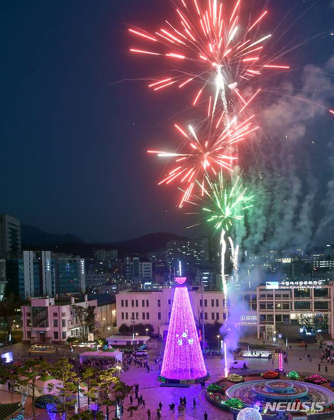 [광주=뉴시스] 류형근 기자 = 5일 오후 광주 동구 5·18민주광장에서 광주기독교교단협의회가 '2021빛고을 성탄 문화축제 트리점화식'을 하고 있다. 2021.12.05. hgryu77@newsis.com