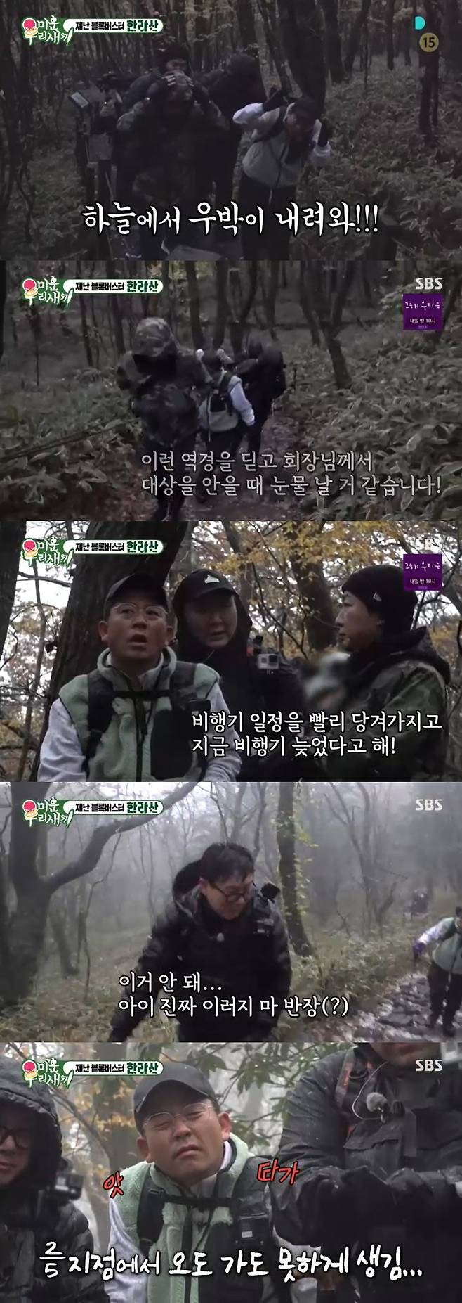 그러나 김종국은 "지금 추워진다. 얼른 열을 내야 한다. 올라가자"며 멤버들을 독려했다. 하지만 어려운 코스는 이제 시작이었다. 다행히 날씨는 좋아졌고, 멤버들은 탁재훈의 대상을 기원하기 위해 계속 올랐다.