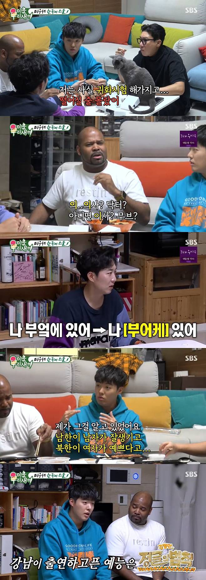 밥을 먹으며 귀화시험 면접 일화도 전했다. 강남은 "통일이 되면 어떨 거 같냐고 질문했다. 근데제가 남쪽엔 잘생기고 북쪽엔 여자가 잘생겼다는 말을 알고 있었다. 그래서 '합치면 난리 날 거 같은데요?'라고 했다. 잘 알고 있다고 해줄 줄 알았는데 6점을 받았다"고 밝혔다.