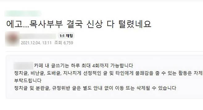 인천 지역 한 맘카페에 따르면 지난 4일 게시판에 '목사 부부 결국 신상 다 털렸네요'라는 글이 올라왔습니다.